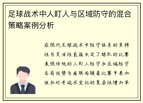 在现代足球战术中,防守体系的多样性与灵活性直接决定了球队的比赛表现。传统的人盯人防守和区域防守各有优势与局限,而随着比赛节奏加快和对手战术变化的复杂性增加,单一防守模式往往难以应对多变的进攻策略。因此...